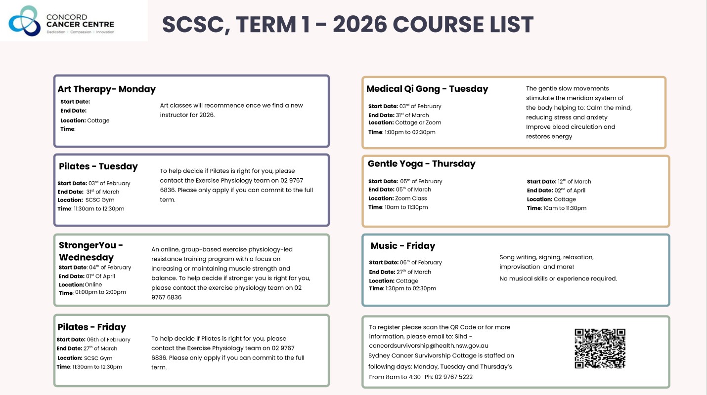 The Survivorship Cottage, in the grounds of Concord Hospital, runs activities for cancer survivors at any stage of their cancer journey, who have had their treatment or are seeing a Cancer Specialist at Concord Cancer Centre.